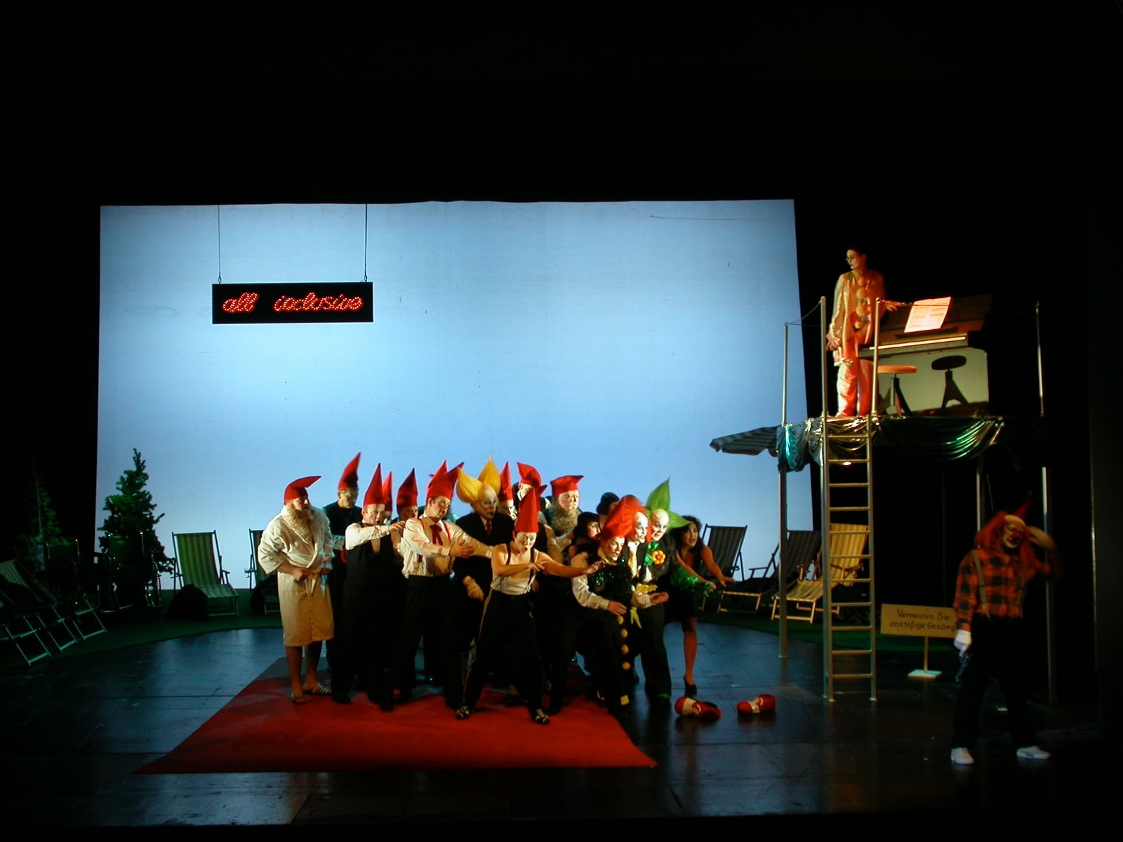 (...) Das Pforzheimer Theater modifiziert hier ein Repertoire der Träume und Alpträume des Menschen-Gegeneinanders zu wahrem Welttheater: schrill, grell, bunt, verletztlich, hysterisch, grausam, hinterhältig, lüstern, eifersüchtig, liebestoll, sexgeil, geldgeil mörderisch, zerstörerisch... In der genialen Inszenierung von Jochen Biganzoli: der geradezu traumhaft bis traumatisch uns s/eine Polarisation des alltäglichen Wahnsinns offeriert und offenbart, werden wir in einer zeitlosen Rakete durchs Universumn unserer Existenzen und Exszesse atomisiert. Und genauso leben und (er)starren wir am Abgrund - außer Kontrolle und doch in allem kontrolliert und konserviert vom Prinzip des Habenwollens, der unsäglichen Gier. (...)