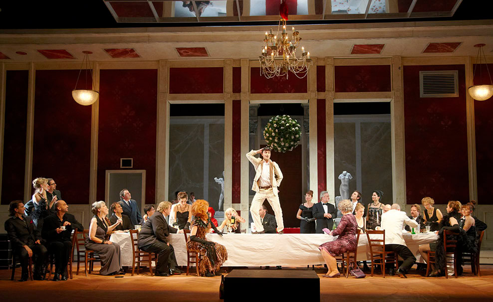 Natürlich, der Cancan ist das Erkennungszeichen dieser Operette, aber das ist vielleicht alles ein großes Missverständnis. Orpheus in der Unterwelt von Jacques Offenbach ist nämlich ursprünglich keine bonbonfarbene Revue für´s Ballett gewesen, sondern eine bitterböse Musik-Satire auf die Zustände der bürgerlichen Gesellschaft im Frankreich von 1858. Ein Zeitstück, voll politischer und sozialer Anspielungen, das die Tagesaktualität nicht scheute. Umso schwerer ist diese Operette, heute, 150 Jahre nach der Uraufführung, im Sinne des Komponisten glaubwürdig zu inszenieren. In Augsburg ist das über weite Strecken gelungen, denn Regisseur Jochen Biganzoli macht aus der launigen Geschichte vom unglücklichen Ehepaar Orpheus und Eurydike, das von der öffentlichen Meinung zur Versöhnung auf den Olymp geschickt wird, kein bunte Tanzshow, sondern ironisches Musiktheater. Das Ganze spielt in einem hohen, lichten Ballsaal, der in der Hölle auf den Kopf gestellt wird. Eine witzige Bildidee von Ausstatter Stefan Morgenstern.